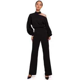 Tento jedinečný overal je rafinovanou kreáciou na veľké príležitosti. Poteší dlhými bufetovými rukávmi s manžetami a extravagantným výstrihom s rozparkom cez jedno rameno. Oblek sa zapína na krytý zips a gombíky.