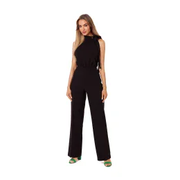 Elegantný nohavicový oblek s ramienkovým výstrihom a nápadným zaväzovaním za krkom. Oblek má kryté zapínanie na zips a vrecká na bokoch.