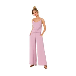 Nohavicový kostým so skladaným výstrihom a tenkými ramienkami zaväzujúcimi sa na chrbte. Kombinéza s elastickým pásom a vreckami na bokoch.