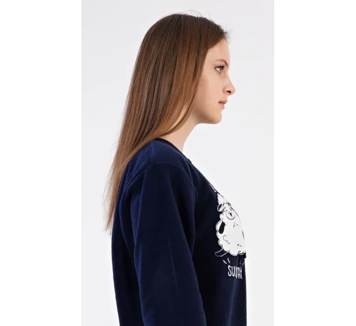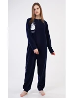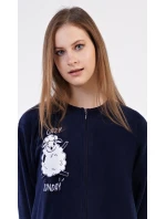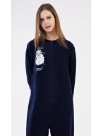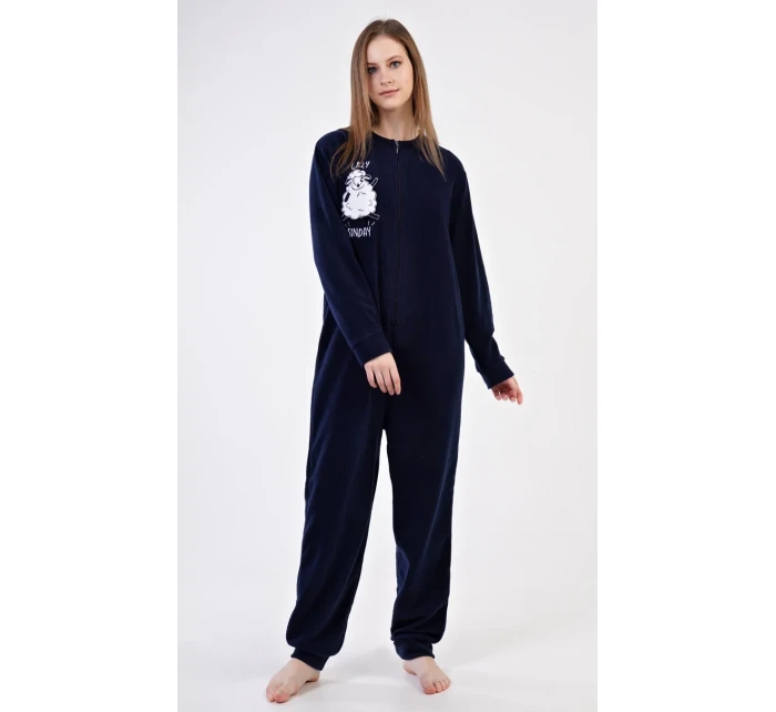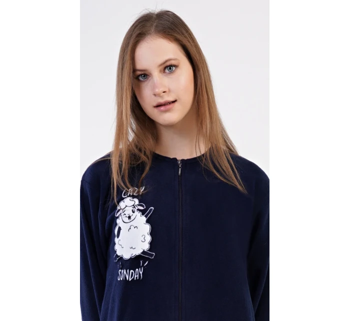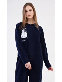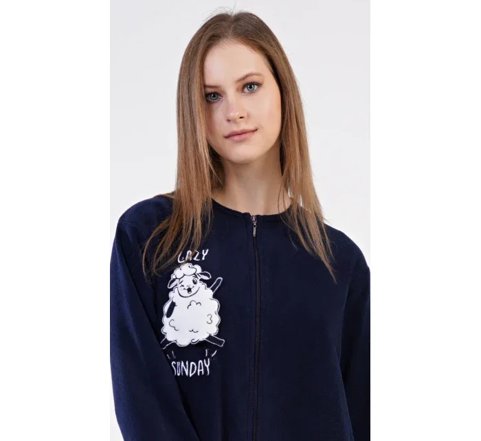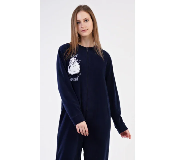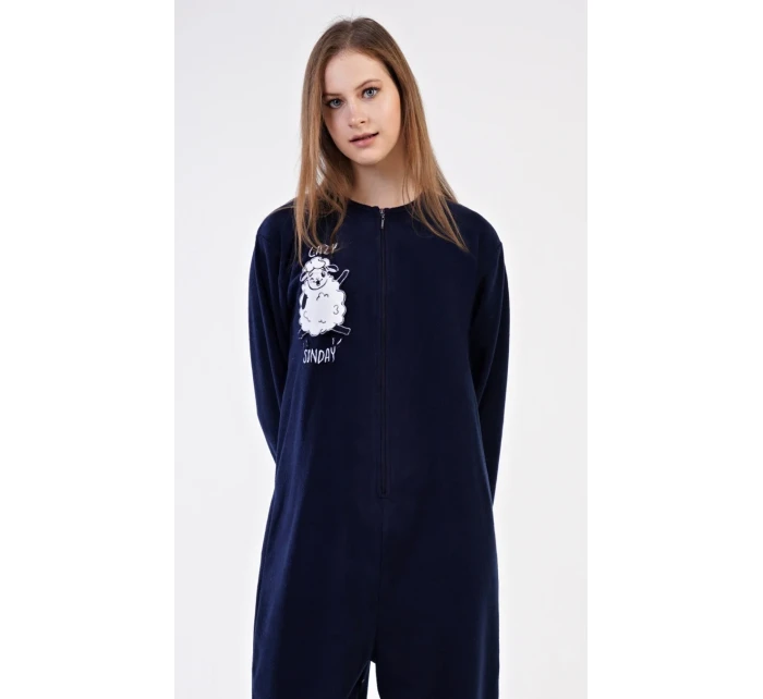 Dámský polarový overal Ovečka. Dámský overal na zip s našitou aplikací s motivem veselé ovečky. Na tmavě modrém podkladu je vyšitý nápis 'Lazy sunday'. Použitý materiál je hřejivý a poddajný na dotek.