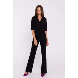 Elegantný tkaný overal s kosticou v páse, ktorá zvýrazňuje pás a dodáva mu ženský nádych. Výstrih do V dodáva elegantný nádych, zatiaľ čo krátke rukávy dodávajú ľahkosť. Skrátené a rozšírené nohavice opticky predlžujú siluetu a vytvárajú moderný a štýlový vzhľad. Overal sa zapína na skrytý zips na chrbte a je bez podšívky pre pohodlné nosenie. Starostlivo navrhnutý a ušitý v Poľsku je ideálnou voľbou pre ženy, ktoré hľadajú módnu alternatívu klasických šiat.