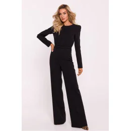 Tento elegantný dámsky overal je vyrobený z kvalitnej tkaniny a spája moderný štýl s pohodlným nosením. Vrchná časť overalu je priliehavá, má dlhé rukávy a ramená boli zvýraznené vysokými vypchávkami, ktoré dodávajú siluete svieži a elegantný vzhľad. Na zadnej strane je ozdobný kovový zips, ktorý plní praktickú aj dekoratívnu funkciu. Nohavice sú mierne rozšírené, čo dodáva celkovému vzhľadu ležérny, elegantný nádych. Overal bol navrhnutý a ušitý v Poľsku, čo zaručuje precíznosť a vysokú kvalitu výrobku.