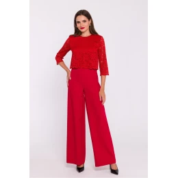 Tento elegantný overal z hladkej tkaniny s čipkovaným vrchným dielom je jedinečnou kombináciou klasiky a elegancie. Vrchný diel z jemnej čipky mu dodáva romantický nádych, zatiaľ čo krátke čipkované rukávy mu dodávajú ľahkosť a jemnú ženskosť. Široké nohavice opticky predlžujú siluetu a zabezpečujú voľnosť pohybu, čím vytvárajú efekt rafinovanej elegancie. Skrytý zips na zadnej strane zaručuje pohodlné obliekanie a dokonalé prispôsobenie. Overal bol navrhnutý a ušitý v Poľsku, čo zaručuje vysokú kvalitu spracovania a pozornosť venovanú detailom. Ideálny na špeciálne príležitosti, keď chcete vyniknúť originálnym štýlom. Zloženie: Vrchný diel: 90 % nylon, 10 % spandex . Spodný diel: 95 % polyester, 5 % elastan.
