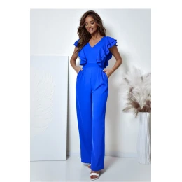 Kombinéza s výstrihom do S, pásom a bočnými vreckami. Kombinéza sa zapína na skrytý zips, vzadu má elastický pás. Kombinéza je zdobená volánmi prechádzajúcimi do krátkych rukávov.