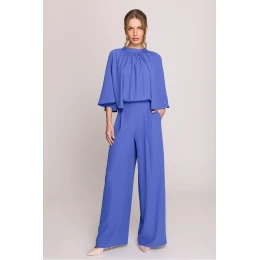 Elegantný a sofistikovaný overal, ktorý spája štýl a pohodlie v dokonalej harmónii. Vrchná časť je jemne uhladená, so širokými kimonovými rukávmi, ktoré jej dodávajú ľahkosť a jemný objem. Výstrih so stojačikom viazaným vzadu dlhými šatkami umožňuje prispôsobiť strih a rozparok na chrbte možno ľubovoľne otvoriť alebo zatvoriť, čím sa prispôsobí vašim preferenciám. Široké, voľne padajúce nohavice dodávajú eleganciu a voľnosť pohybu a bočné vrecká zabezpečujú funkčnosť. Model sa vzadu zapína na skrytý zips, čo zdôrazňuje jeho estetický dizajn. Navrhnutý a ušitý v Poľsku s najvyššou pozornosťou venovanou detailom. Ideálny na špeciálne príležitosti a štýlové výlety. Dĺžka v tabuľke sa vzťahuje na dĺžku nohavíc.