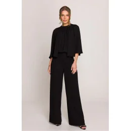 Elegantný a sofistikovaný overal, ktorý spája štýl a pohodlie v dokonalej harmónii. Vrchná časť je jemne nariasená, so širokými kimonovými rukávmi, ktoré dodávajú ľahkosť a jemný objem. Stojatý výstrih, ktorý sa vzadu zaväzuje na dlhé šatky, umožňuje prispôsobiť strih a rozparok na chrbte možno voľne otvoriť alebo zatvoriť, podľa vašich preferencií. Široké, voľne padajúce nohavice dodávajú eleganciu a voľnosť pohybu a bočné vrecká zabezpečujú funkčnosť. Model sa vzadu zapína na skrytý zips, ktorý zdôrazňuje jeho estetický dizajn. Navrhnutý a ušitý v Poľsku s najvyššou pozornosťou venovanou detailom. Ideálny na špeciálne príležitosti a štýlové výlety. Dĺžka v tabuľke sa vzťahuje na dĺžku nohavíc.