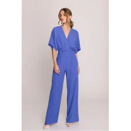 Elegantný a štýlový dámsky overal, ktorý spája pohodlie so ženským strihom. Vrchný diel v štýle krížového goliera s jemnými záhybmi sa krásne prispôsobí postave a výstrih do V dodáva ľahkosť a zvýrazňuje dekolt. Krátke rukávy zabezpečujú pohodlie a voľnosť pohybu. Mierne rozšírené nohavice dodávajú celku harmonické proporcie a bočné vrecká praktický charakter. Model sa zapína na skrytý zips na chrbte, vďaka čomu pôsobí esteticky a elegantne. Overal navrhnutý a ušitý v Poľsku s dôrazom na detail. Ideálna voľba na každý deň, do práce alebo na špeciálne príležitosti.