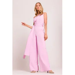 Elegantný asymetrický overal na jedno rameno, ktorý upúta pozornosť svojím jedinečným tvarom. Dlhé šály vsadené do bokov mu dodávajú ľahkosť a efektný charakter, čo umožňuje zaujímavé štylizácie. Mierne rozšírené nohavice poskytujú pohodlie a elegantný vzhľad. Model sa zapína na skrytý zips na boku, čo zaručuje ideálne prispôsobenie. Celý kúsok je navrhnutý a ušitý v Poľsku s najvyšším dôrazom na detail, pričom spája modernosť s klasikou.