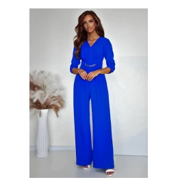 Elegantný a pohodlný overal s elegantným strihom, ideálny na rôzne príležitosti. Je vyrobený z ľahkého, na dotyk príjemného materiálu, ktorý poskytuje pohodlie pri nosení. Má srdiečkový výstrih, ktorý jemne zvýrazňuje dekolt a dodáva ženský nádych. V páse a na rukávoch je elastická guma, vďaka ktorej sa overal dokonale prispôsobí postave. Vložené vrecká na bokoch dodávajú funkčnosť a skrytý zips zabezpečuje estetický vzhľad. Ozdobná retiazka v páse je štýlovým akcentom, ktorý zvýrazňuje pás a dodáva celému kúsku osobitý charakter. Ideálna voľba na každodenné štylizácie, stretnutia alebo večerné vychádzky.