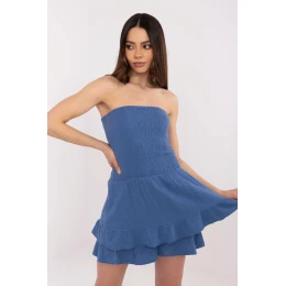 Elegantný overal pre ženy ideálny na každodenné štylizovanie, ktorý spája pohodlie s módnym vzhľadom. Je vyrobený z mäkkej bavlny a poskytuje pohodlie počas celého dňa. Vďaka krátkym nohaviciam a strihu bez rukávov je tento overal skvelou voľbou na teplejšie dni. Overal má jednoduchý, hladký vzor, ktorý zdôrazňuje minimalistický charakter oblečenia. Drapéria v hornej časti a volánik na spodnom okraji dodávajú celku ľahkosť a jemnú ženskosť. Konštrukcia bez gombíkov zaručuje pohodlie pri nosení a jednoduché obliekanie.