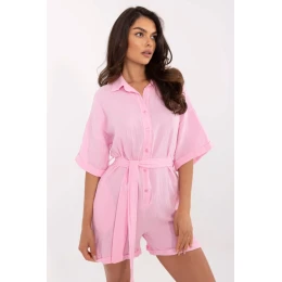 Tento ľahký mušelínový bavlnený overal je ideálnou voľbou na každodenné oblečenie počas teplejších dní. Hladká štruktúra materiálu a prirodzená priedušnosť bavlny zaručujú pohodlie počas celého dňa. Model s krátkymi rukávmi a klasickým golierom spája voľnosť a štýl. Zapínanie na gombíky vpredu uľahčuje obliekanie a dodáva elegantný nádych. Overal je vybavený opaskom na zaväzovanie z látky, ktorý zvýrazňuje pás a dodáva postave ženský tvar. Vložené vrecká na bokoch zvyšujú jeho funkčnosť a pohodlie. Je praktickou a štýlovou voľbou na leto, skvelou voľbou na prechádzku, nákupy alebo neformálne stretnutie s priateľmi.