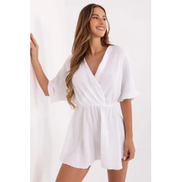 Tento ľahký a vzdušný mušelínový overal je ideálnou voľbou na každodenný letný styling. Je vyrobený z prírodnej, priedušnej bavlny a zaručuje pohodlie počas celého dňa, dokonca aj v horúcich dňoch. Model s krátkou dĺžkou a krátkymi rukávmi má nariasený výstrih, ktorý jemne zvýrazňuje dekolt a výstrih. V páse je vložený elastický pás, vďaka ktorému sa overal prispôsobí postave a zvýrazní jej proporcie. Vďaka absencii zapínania je obliekanie rýchle a pohodlné. Hladká štruktúra látky a jednoduchý strih z neho robia univerzálny kúsok šatníka, ideálny na prechádzku, nákupy alebo letné posedenie s priateľmi.