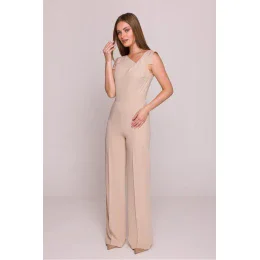Moderný overal vyrobený z hladkej, mierne elastickej tkaniny so saténovou úpravou, ktorá mu dodáva jemný lesk a eleganciu. Model bez rukávov s asymetrickým výstrihom zdobí efektný záves, ktorý priťahuje pozornosť a zdôrazňuje jedinečný charakter oblečenia. Skryté zapínanie na zips na chrbte zaručuje pohodlie a udržuje čistý vzhľad. Vrchná časť overalu je priliehavá, s vysokým pásom, ktorý zvýrazňuje pás a dodáva siluete ženský tvar. Široké nohavice s ohrnutým lemom dodávajú štýl a zabezpečujú pohodlie pri nosení. Praktickým doplnkom sú bočné vrecká a absencia podšívky zaručuje, že overal je ľahký a priedušný. Navrhnutý a ušitý v Poľsku.