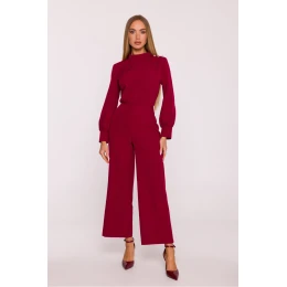 Elegantní kombinéza ušitá z hladké látky s matným povrchem je návrh, který kombinuje moderní charakter s nadčasovou elegancí. Jednodílný střih krásně zdůrazňuje postavu, a přizpůsobený pas a široké nohavice 7/8 dodávají celku lehkost a svobodu. Vrchní část kombinézy se vyznačuje stojánkem s jemným zahuštěním na rameni, které jemně modeluje linii ramen a dodává výjimečný šarm. Dlouhé rukávy jsou zakončeny širokými manžetami s rozkrokem, zdůrazňující elegantní charakter projektu. Ozdobné knoflíky na rameni tvoří stylový detail, který celku dodává nezaměnitelnost. Model se zapíná na skrytý zip vzadu, co zajišťuje pohodlné oblékání a estetické provedení. Chybějící podšívka a kapsy zajišťují, že kombinéza zůstává lehká, a hladká látka umožňuje vytváření mnoha různorodých stylizací, od každodenních po večerní. Navržen a ušit v Polsku, vytvořen s ohledem na ženy, které oceňují eleganci, pohodlí a nadčasov