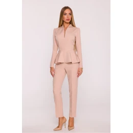 Elegantní kombinéza ušitá z hladké látky s matným povrchem je ideální kombinací moderního stylu a ženské formy. Jednodílný střih byl navržen tak, aby jemně modeloval postavu a zdůrazňoval její přednosti. Výstřih ve tvaru písmene V s možností regulace hloubky díky rozepínacímu zipu dodává celku smyslný charakter. Dlouhé rukávy přinášejí špetku elegance, zatímco skrytý zip vpředu zaručuje pohodlí a elegantní dokončení. Pas je zdůrazněn střihem a efektní baskinkou, která zdůrazňuje pas a zakrývá boky, část hýždí a břicho, dodávající postavě harmonický tvar. Nohavice po kotníky jsou směřovány ke spodní části, což opticky zjemňuje nohy a dodává jim lehkost. Chybějící kapsy a podšívka zajišťují, že kombinéza zůstává lehká a pohodlná, zatímco si zachovává elegantní, rafinovaný vzhled. Navrženo a ušito v Polsku, vytvořeno pro ženy, které chtějí mít jistotu a cítit se výjimečně ve každé situaci.