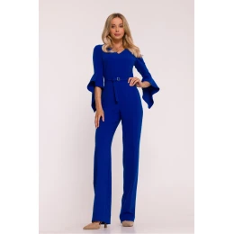 Dámsky overal z hladkej tkaniny s jemným povrchom, ktorý spája eleganciu s modernými detailmi. Výstrih v tvare písmena V jemne zvýrazňuje postavu, zatiaľ čo rukávy v dĺžke 7/8 ukončené volánom dodávajú celku ľahkosť a výnimočný charakter. Priliehavý vrch harmonicky ladí s rovnými nohavicami s ohrnutým lemom, čím vytvára súvislú, elegantnú líniu. Pás je zvýraznený opaskom so sponou, ktorý ešte viac podčiarkuje ženskú siluetu. Model sa zapína na skrytý zips na chrbte, je bez vreciek a podšívky, vďaka čomu je ľahký a pohodlný na nosenie. Ideálna voľba na elegantné večierky, obchodné stretnutia a výnimočné príležitosti. Navrhnutý a ušitý v Poľsku.