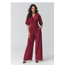 Tento elegantný dámsky overal je ideálnou voľbou pre ženy, ktoré oceňujú eleganciu, pohodlie a nadčasový štýl. Model má ženský strih s prekrývajúcim sa výstrihom, ktorý jemne zvýrazňuje postavu a dodáva stylingu ľahkosť a noblesu. Prispôsobený pás krásne modeluje proporcie tela a široké nohavice dodávajú celému kúsku moderný charakter a zabezpečujú úplnú voľnosť pohybu. Tento elegantný overal na špeciálne príležitosti je ideálny na večierky, rodinné oslavy, pracovné stretnutia alebo večerné vychádzky. Vďaka starostlivo navrhnutému strihu spája pohodlie pri nosení s módnym vzhľadom, takže je skvelou alternatívou klasických šiat. Kratšie rukávy zabezpečujú pohodlie a praktické vrecká zvyšujú funkčnosť modelu.