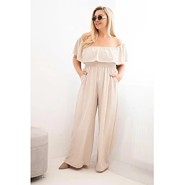 Kombinéza plus size je výnimočne štýlovou a pohodlnou ponukou pre ženy, ktoré ocenia módny vzhľad a pohodlie v každej situácii. Model vyniká efektným volánom vo výstrihu a krátkymi, vzdušnými rukávmi, ktoré celku dodávajú ľahkosť a ženský šarm. Elastický vrchný diel s volánom sa dokonale prispôsobí postave, zvýrazní pás a zabezpečí pohodlie počas celého dňa.