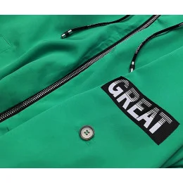 Přehoz se zapíná zipem a má dvě kapsy bez zapínání. Vzadu je v pase guma. Rukávy je možné ohrnout. Přední část modelu má délku k bokům a zadní část má délku do poloviny stehen.