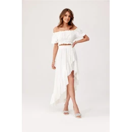 Súprava asymetrickej blúzky a sukne je vyrobená z mäkkého a príjemného materiálu, ktorý poskytne pohodlie aj tým najnáročnejším ženám. Súprava sa skladá z krátkeho topu a asymetrickej sukne. Top má krásne odhalené ramená a volániky v páse a výstrihu. Sukňa zasa zaujme krásnym asymetrickým strihom, volánikmi v prednej časti a elastickým pásom, ktorý sa prispôsobí každej postave. Letná súprava dokonale pristane každému typu krásy, pretože je k dispozícii vo veľkej škále farieb. Výrobok je vyrobený a ušitý v Poľsku.