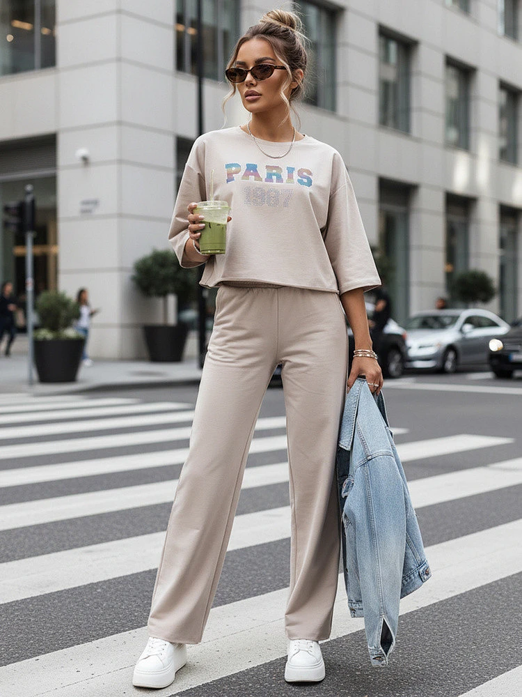 Podtrhněte svou osobnost se soupravou MILEKAN, kde se moderní potisk snoubí s klasickými střihy. Tričko s krátkým rukávem a kulatým výstřihem je kvintesencí každodenní elegance. Široké kalhoty dodávají siluetě lehkost, zatímco praktické kapsy jsou dokonalou kombinací funkčnosti a módního designu. Zvolte si soupravu MILEKAN a dopřejte si luxus každodenního pohodlí, aniž byste ztratili svou elegantní povahu.
