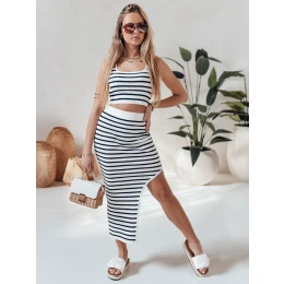 Tento dámsky pruhovaný komplet je ideálny na teplejšie dni. Krátky top s hrubšími ramienkami a klasickým výstrihom má moderný vzhľad, zatiaľ čo priliehavá maxi sukňa s vysokým pásom a pútavým rozparkom dodáva charakter. Pruhovaný vzor opticky zoštíhľuje siluetu. Jednofarebný dizajn je vhodný pre veľkosti XS až L. Materiál je mäkký na dotyk, elastický a dokonale sa prispôsobí telu, čo zaručuje voľnosť pri nosení počas teplých dní.