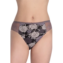 Spodný diel bikín LAMA s kvetinovým vzorom je dokonalým spojením ženskej elegancie a každodenného pohodlia. Prednú časť zdobia ozdobné kvety v bielych a fialových odtieňoch na čiernom pozadí, vďaka ktorým model pôsobí módne a vynikne na pozadí klasickej spodnej bielizne. Boky z jemnej slivkovej čipky dodávajú spodnému dielu ľahký a zmyselný vzhľad.