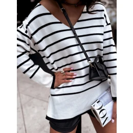 Sveter HECATE je ideálny na jeseň! Vďaka dlhým rukávom a dlhšiemu strihu poskytuje tento sveter nielen jedinečný štýl, ale aj úplné pohodlie. Nadčasové pruhy sú ideálne na jesenné stylingy, zatiaľ čo výstrih do V dodáva charakter. Nevyhnutný doplnok vášho šatníka!