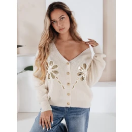 Sveter na gombíky, zdobený flitrovými kvetinovými aplikáciami. Mäkká tkanina a voľný strih poskytujú pohodlie, zatiaľ čo ozdobné detaily upútajú pozornosť. Skvelý na prechodné ročné obdobia, hodí sa k džínsom aj sukniam.