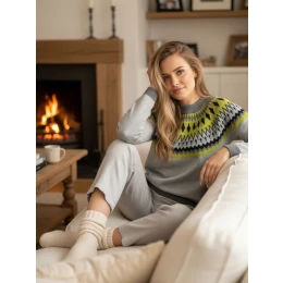 Hrejivý sveter s jedinečným vzorom v škandinávskom štýle, ideálny na chladnejšie dni. Mäkká a na dotyk príjemná tkanina zaručuje pohodlie, zatiaľ čo nadčasový dizajn sa dobre kombinuje s džínsami alebo sukňami. Ideálna voľba pre milovníčky elegancie a pohodlia.