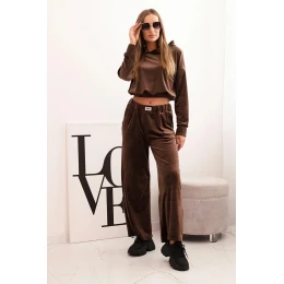 Dámský teplákový komplet z veluru se širokými nohavicemi a mikinou s kapucí hnědý