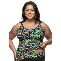 Dámske plavky tankiny FANTASY z kolekcie Tropic. Plavky tankiny majú strih s tielkom, ktoré sa smerom nadol rozširuje. Prednú stranu lemuje bandeau podprsenka s vyberateľnými výstužami, pod prsiami je všitá mäkká guma, ktorá sa nezarezáva. Košíčky sú z vonkajšej strany hladké, na bokoch sú prešité, aby plavky dobre sedeli. Ramienka sú širšie, pevne všité, s nastaviteľnou dĺžkou. Celý diel je hladký a jednoduchý. Tankiny možno kombinovať s ľubovoľnými nohavičkami z rovnakej kolekcie.