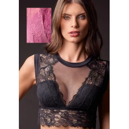 Elegantný čipkovaný top značky Lormar v sebe spája jemnosť, zmyselnosť a moderný dizajn. Prednú časť zdobí odvážna čipka doplnená priehľadným tylom, ktorá vytvára pôsobivý výstrih a dodáva celému modelu ľahkosť. Zadnú časť tvorí kombinácia jemnej čipky a priehľadného tylu, ktorá poskytuje vzdušný a rafinovaný vzhľad. Top je navrhnutý bez kostice pre maximálne pohodlie a prirodzený pocit pri nosení. Dostupná ružová verzia zodpovedá odtieňu zo vzorových fotografií.
