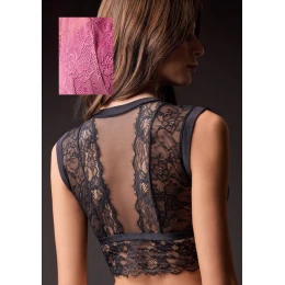 Elegantní krajkový top Lormar spojuje jemnost, smyslnost a moderní design. Přední část zdobí výrazná krajka doplněná transparentním tylem, který vytváří působivý dekolt a dodává celému modelu lehkost. Zadní díl je tvořen kombinací jemné krajky a průsvitného tylu, což zajišťuje vzdušnost a rafinovaný vzhled. Top je navržen bez kostic pro maximální pohodlí a přirozený pocit při nošení. Dostupná růžová varianta odpovídá odstínu z ukázkových fotografií.