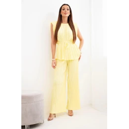 Dámský viskózový model 22025246 komplet s vázanou blůzou a širokými kalhotami žlutý - K-Fashion
