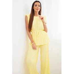 Dámska plisovaná súprava z viskózy s viazanou blúzkou a širokými nohavicami žltá