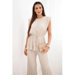 Dámsky viskózový plisovaný komplet s viazanou blúzkou a širokými nohavicami béžovej farby