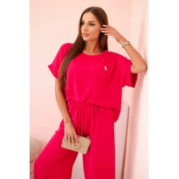Dámsky viskózový set s ozdobným kvetom a širokými nohavicami - fuchsiová