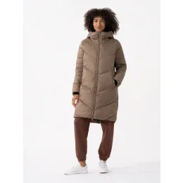 Dámsky páperový kabát s výplňou zo syntetického peria, ktorý zaisťuje optimálny tepelný komfort v prechodnom období. Plášť má dodatočnú impregnačnú vrstvu, ktorá chráni pred nadmernou absorpciou vlhkosti z vonkajšej strany.