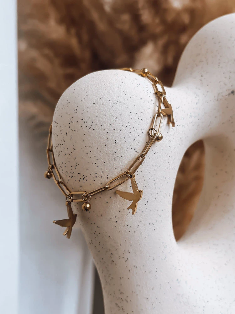 PAJARO - úžasný náramok s motívom vtáka, ideálny pre všetky štýlové ženy. Zapína sa pomocou karabínky s niekoľkocentimetrovou reguláciou.