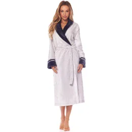 Dámsky dlhý župan 2206 Claudia L&L - veľmi jemný a príjemný na dotyk materiál - perleťová farba - po stranách našité vrecká - zapínanie na opasok - kontrastné lemovanie Zloženie materiálu: 100% polyester
