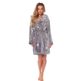 Dámsky krátky župan 2212 L&L - z mäkkej tkaniny veľmi príjemnej na dotyk - melanžová farba s potlačou hviezdičiek - po stranách našité vrecká - s kapucňou - zapínanie na opasok v páse