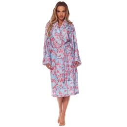 Dámsky župan 2216 Fida L&L - svetlomodrý - z mäkkého materiálu s bambusom - s potlačou - vrecká a zaväzovanie v páse - so šálovým golierom - dlhý