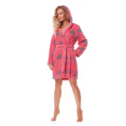 Dámsky krátky župan 2310 Futura L&L - veľmi mäkký a príjemný na dotyk - amarantová farba so sivými srdiečkami - po stranách našité vrecká - zapínanie na opasok - s kapucňou