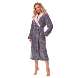 Dámsky župan 2314 Duo L&L - sivý - z mäkkej tkaniny veľmi príjemnej na dotyk - výšivka na hrudi - so šálovým golierom v ružovej farbe - vrecká na bokoch - zapínanie na opasok Zloženie materiálu: 100% polyester