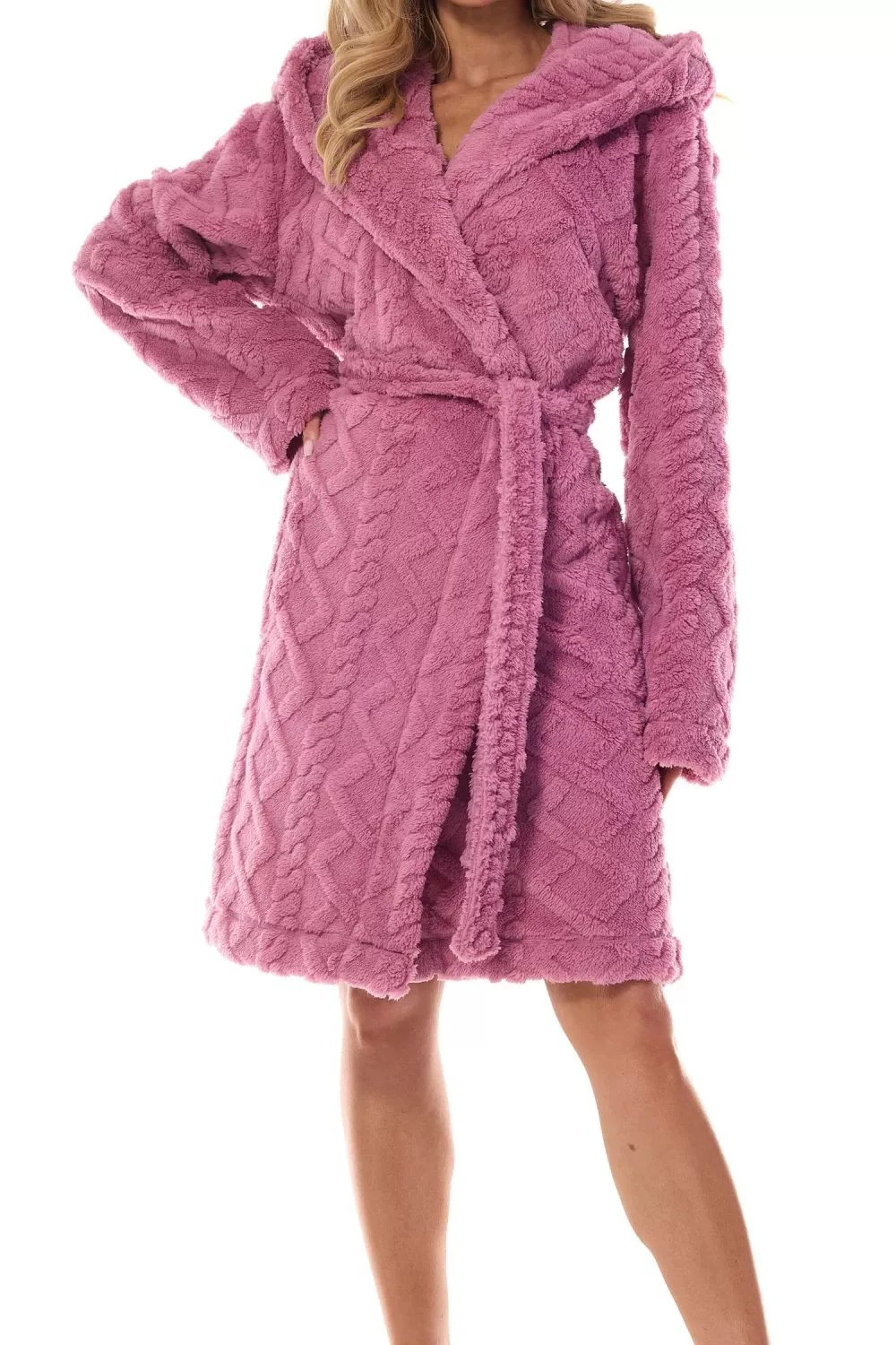 Dámský župan 2401 Geo L&L - fialová barva - z měkkého materiálu typu soft - kapsy a v pase vázání na pásek - se vzorem - s kapucí - délka ke kolenůmMateriálové složení: 100% polyester