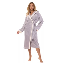 Dámsky župan 2419 Tess crystal plus L&L - sivá farba - z mäkkého materiálu - ozdobná výšivka na hrudi - vrecká a zaväzovanie v páse - kontrastné lemovanie - kapucňa - dlhý