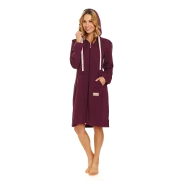 Dámsky župan 7107 Doctornap - bordová farba - vyrobený z kvalitnej bavlny - dlhé rukávy - pohodlné vrecká na bokoch - zapínanie na zips - s kapucňou - sťahovacia šnúrka s logom - certifikát OEKO-TEX Standard 100