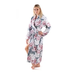 Aisha, dámsky teplý župan s motívom pivonky na sivom pozadí dĺžka: 125cm S, 130cm M, 135cm L, 140cm XL, 145cm XXL strih: župan s golierom, vrecká v bočnom šve, opasok veľkosť: S,M,L,XL,XXL