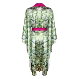 Stylová spodní sukně pokrytá světle zeleným potiskem tropických listů. Přední díl je zvýrazněn lemováním ve výrazné fuchsiové barvě. V pase je vázačka, rovněž v růžové barvě. Přinášíme vám krásnou saténovou nabídku z nejnovější kolekce DKaren, která vám umožní užívat si léto prakticky po celý rok. Asymetrický střih, vpředu kratší, vzadu delší. Rukávy ve stylu kimona. Složení: 100% polyester.